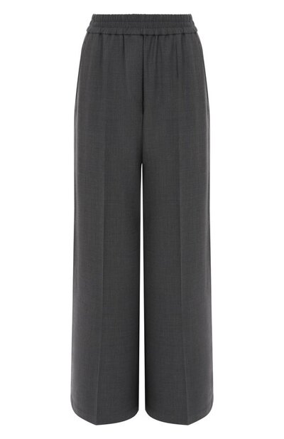Широкие брюки со стрелками выполнили из стрейчевой костюмной шерсти с добавлением полиамида. Модель с эластичным поясом и имитацией ширинки дополнили боковыми карманами и накладными задними.