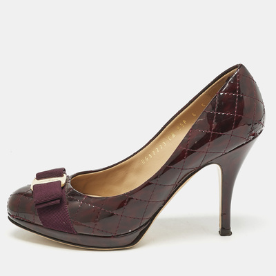 Ferragamo’s iconic Vara pumps get a rich update in burgundy quilted patent leather. Topped with the signature bow and gold tone hardware, they’re timeless and tailored. A versatile pair that complements everything from shift dresses to tailored pants.