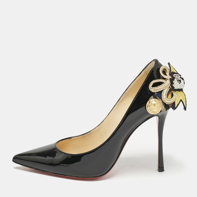 A vision of Parisian elegance, the Christian Louboutin Galonna pumps in glossy black patent leather are a timeless addition to any wardrobe. With a classic pointed toe and slender stiletto heel, they exude refined sophistication. Finished with the signature red sole and chic signature elements on the back , these pumps offer an instant lift