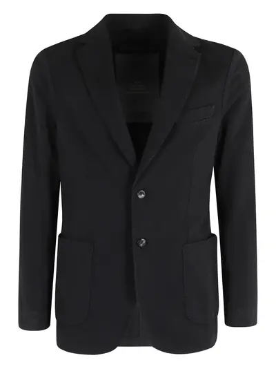 black front button fastening notched lapels two front patch pockets buttoned cuffs