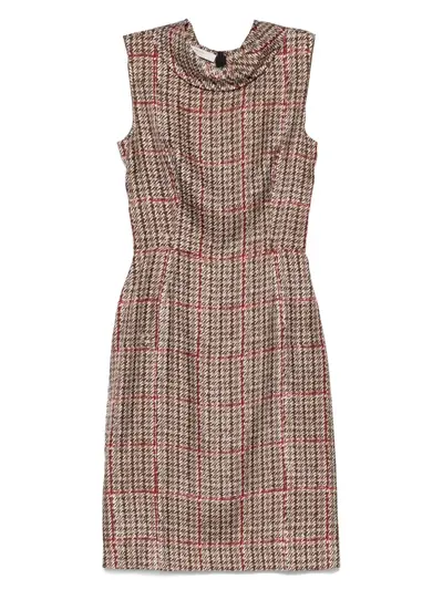 circa 2000s brown silk houndstooth pattern rear zip fastening crew neck sleeveless mid-length Condition: EXCELLENT. This previously owned item is in near-perfect condition with no signs of damage or use.