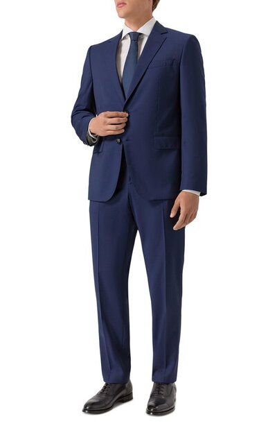 Костюм-двойку выполнили из тонкой шерстяной ткани в едва заметную полоску. Однобортный полуприталенный пиджак с двумя шлицами дополнили внутренним и тремя внешними карманами, а брюки со стрелками – боковыми и задними.