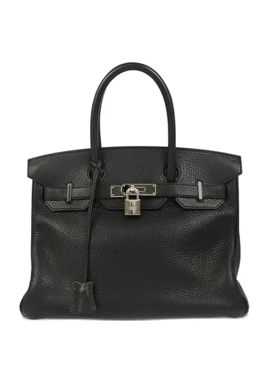 circa 2016 black structured design padlock detail dual top handles embossed logo accents Condition: GOOD. This previously owned and used item is in good condition with minimal signs of use. This may include fading of material or plating and scratches.