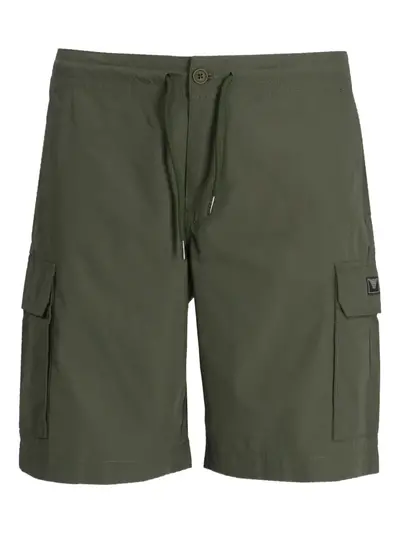 sage green elasticated drawstring waistband two side cargo pockets two rear flap pockets logo patch to the side