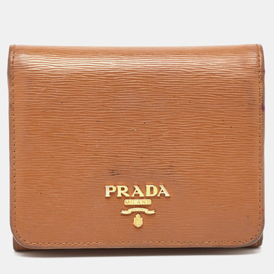 Crafted from Prada’s signature Vitello Move leather, this tan trifold wallet blends timeless design with practical sophistication. The textured finish enhances durability, while the compact silhouette unfolds to reveal multiple card slots, a bill compartment, and a snap button coin pocket. Finished with the iconic metal logo, it’s a refined essential for everyday elegance.