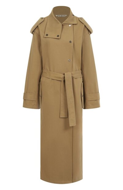 Oversize-тренч с погонами и патами выполнили из микса хлопка и полиэстера. Модель с двумя карманами по бокам застегивается кнопками, часть из которых позволяет закрыть лацканы наглухо и превратить отложной воротник в стойку. В комплекте — пояс в тон.