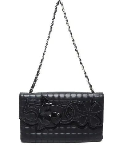 circa 2005-2006 black lambskin signature Choco Bar quilting signature camellia chain-link and leather shoulder strap foldover top with magnetic fastening partitioned compartment internal zip-dastening pocket rear patch pocket silver-tone hardware Serial Number 10275932 This item comes with an original authenticity seal. Condition: GOOD. This previously owned and used item is in good condition with minimal signs of use. This may include fading of material or plating and scratches.