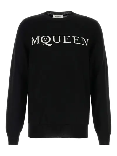 black intarsia knit logo crew neck long sleeves ribbed cuffs and hem