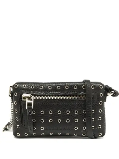 black eyelet detailing front zip pocket adjustable shoulder strap silver-tone hardware Condition: GOOD. This previously owned and used item is in good condition with minimal signs of use. This may include fading of material or plating and scratches.