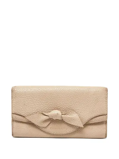 light beige calf leather foldover top bow detailing logo print to the front internal logo stamp internal card slots internal slip pocket logo-jacquard lining Condition: GOOD. This previously owned and used item is in good condition with minimal signs of use. This may include fading of material or plating and scratches.