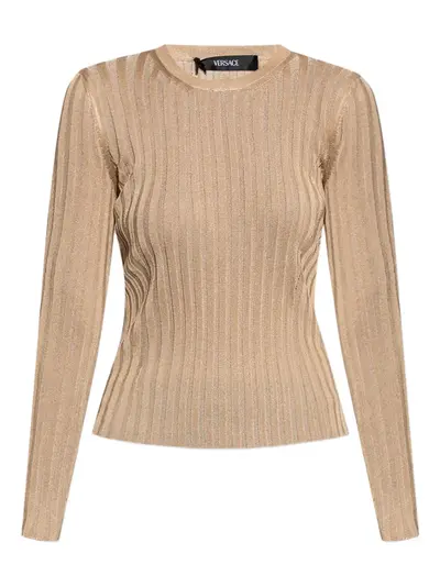 beige vertical ribbing crew neckline slim fit long sleeves lightweight design