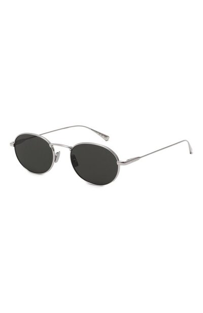 Солнцезащитные очки с затемненными линзами выполнили из металла. Тонкие дужки модели украсили выгравированным логотипом бренда.