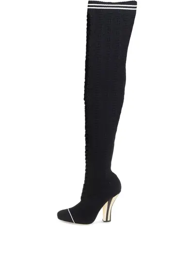 black pointelle knit thigh-high front lace-up fastening stripe trim high heel round toe branded leather insole Condition: GOOD. This previously owned and used item is in good condition with minimal signs of use. This may include fading of material or plating and scratches.
