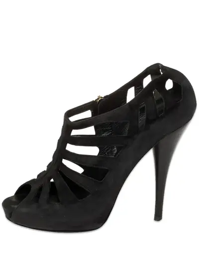 black calf leather calf suede side zip fastening high stiletto heel platform sole peep toe caged design branded leather insole Condition: GOOD. This previously owned and used item is in good condition with minimal signs of use. This may include fading of material or plating and scratches.