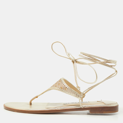 Gold leather straps wrap the ankle, while a glittery upper patch softens the look. These pre loved Jimmy Choo flats are lightweight, airy, and unexpected.