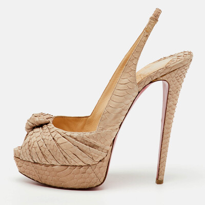 Emitting confidence and style, these Christian Louboutin pumps will give you a futuristic and edgy look. Their beige python leather exterior combines a pleated design with a knot motif on the toe tops. They come with peep toes, elasticized ankle straps and covered platforms. The 15.5cm heels add just the right amount of height. The sandals are coupled with leather lining.