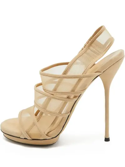 light beige elasticated slingback strap leather sole branded leather insole leather trim almond open toe Condition: GOOD. This previously owned and used item is in good condition with minimal signs of use. This may include fading of material or plating and scratches.