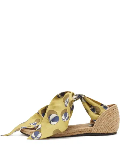 yellow ball print all-over logo print self-tie fastening thong strap flat leather sole Condition: GOOD. This previously owned and used item is in good condition with minimal signs of use. This may include fading of material or plating and scratches.