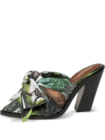 green satin finish all-over graphic print bow detailing slip-on style branded footbed pointed toe high block heel Condition: GOOD. This previously owned and used item is in good condition with minimal signs of use. This may include fading of material or plating and scratches.