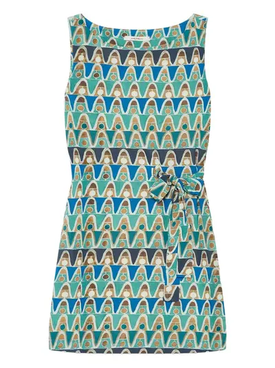 blue geometric-print sleeveless front tie fastening boat neck straight hem