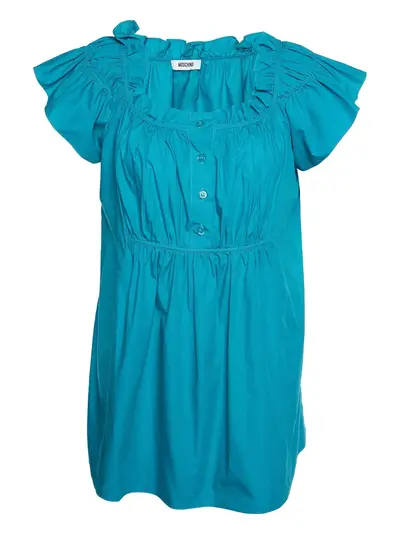 sky blue cotton ruffled detailing front button fastening elasticated drawstring waistband scoop neck short sleeves flared hem Condition: UNWORN. This item is previously owned but remains unworn and in its original condition. However, it does not come with its original tags.
