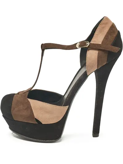 brown suede panels t-bar design 140mm heel buckle-fastening strap Condition: GOOD. This previously owned and used item is in good condition with minimal signs of use. This may include fading of material or plating and scratches.