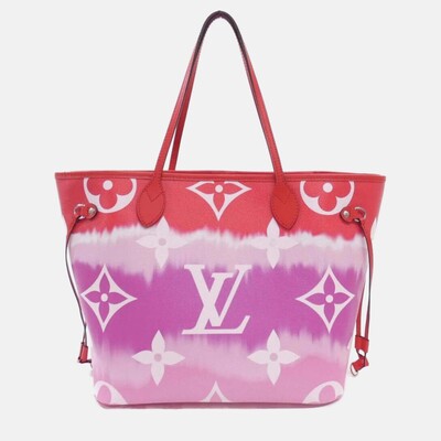 The Louis Vuitton Escale Neverfull MM Handbag features pink and red coated canvas with the iconic monogram pattern and a spacious design. This pre loved piece offers a perfect blend of vibrant style and practicality.
