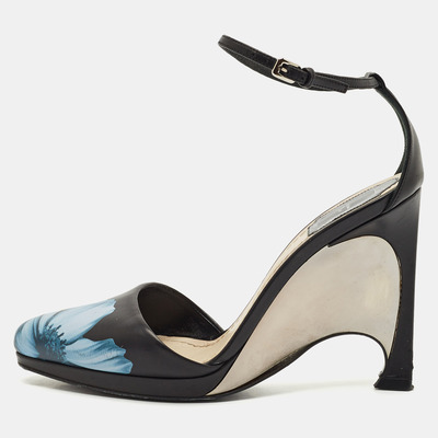 Dior Black Floral Print Leather Optique Wedge Ankle Strap Sandals Size 38.5 1167402 (чёрный, lpn30069460)