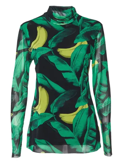 green tropical banana leaf print high neck long sleeves sheer fabric curved hem Condition: GOOD. This previously owned and used item is in good condition with minimal signs of use. This may include fading of material or plating and scratches.