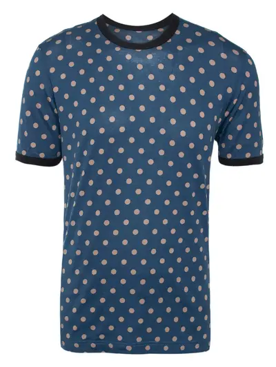 navy blue cotton contrasting black collar short sleeves all-over polka dot pattern crew neck Condition: GOOD. This previously owned and used item is in good condition with minimal signs of use. This may include fading of material or plating and scratches.