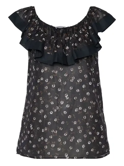black cotton floral print ruffled trim wide neck sleeveless straight hem Condition: GOOD. This previously owned and used item is in good condition with minimal signs of use. This may include fading of material or plating and scratches.