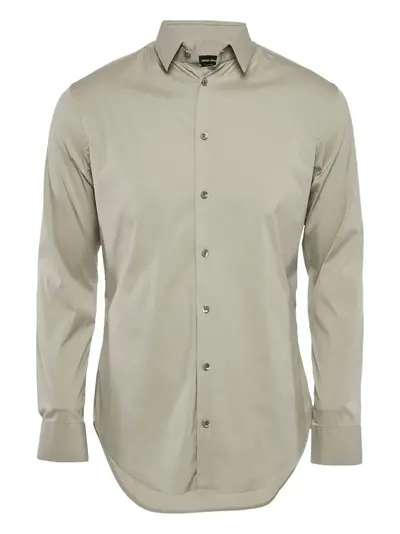 nickel grey cotton blend stretch-design spread collar front button fastening long sleeves buttoned cuffs curved hem Condition: GOOD. This previously owned and used item is in good condition with minimal signs of use. This may include fading of material or plating and scratches.