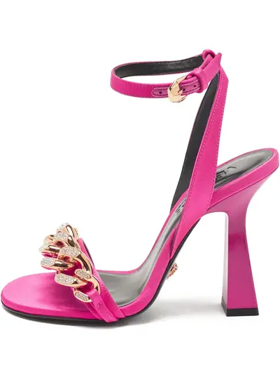 fuchsia pink satin weave buckle-fastening ankle strap leather sole branded leather insole Medusa Head motif chain-link detailing rhinestone embellishment almond open toe Condition: UNWORN. This item is previously owned but remains unworn and in its original condition. However, it does not come with its original tags.