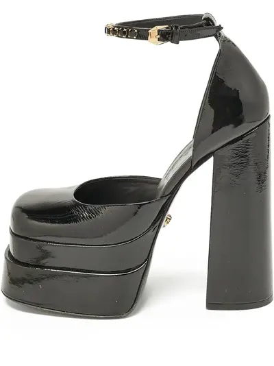 black leather patent finish buckle-fastening ankle strap high block heel platform sole branded footbed square toe Condition: GOOD. This previously owned and used item is in good condition with minimal signs of use. This may include fading of material or plating and scratches.