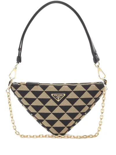 circa 2020s beige/black canvas patterned jacquard enamel triangle logo detachable chain-link top handle single detachable top handle top zip fastening main compartment logo-jacquard lining gold-tone hardware Condition: UNWORN. This item is previously owned but remains unworn and in its original condition. However, it does not come with its original tags.