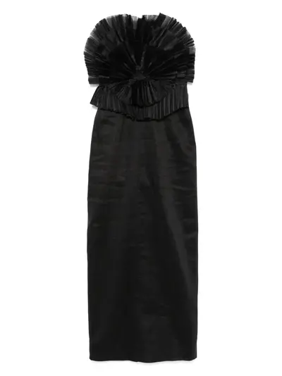 black concealed rear zip fastening strapless ruffled detailing boned bodice