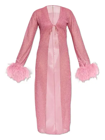 pink lurex detailing feather trim long sleeves V-neck tie fastening