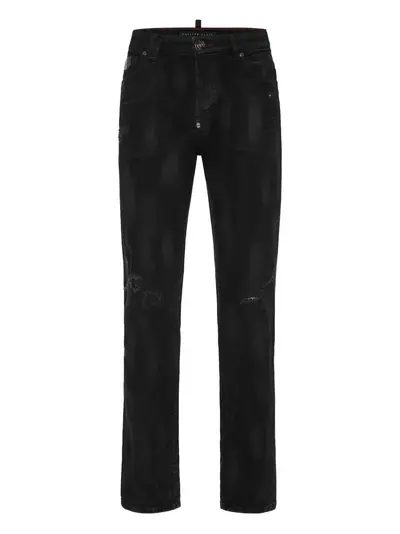 black button and zip front fastening belt loops rear logo patch distressed detailing classic five pockets