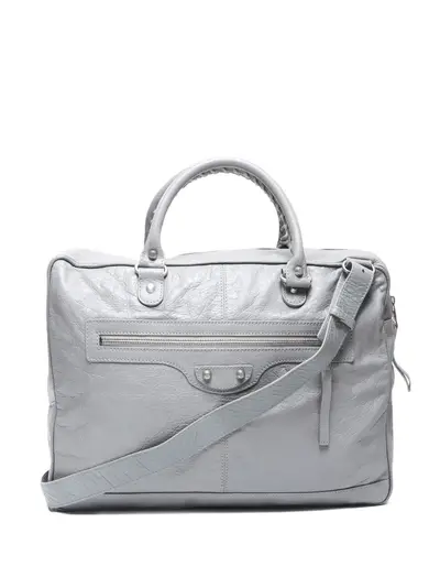 circa 2010s grey leather two top handles silver tone hardware zipper closure detachable shoulder strap Condition: GOOD. This previously owned and used item is in good condition with minimal signs of use. This may include fading of material or plating and scratches.