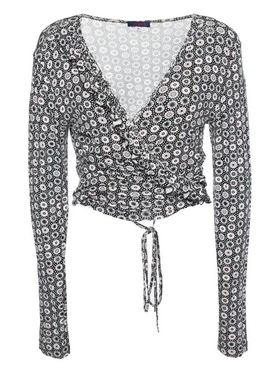 circa 2023 black floral pattern wrap detail long sleeves ruffle v-neck tie closure at back Condition: GOOD. This previously owned and used item is in good condition with minimal signs of use. This may include fading of material or plating and scratches.