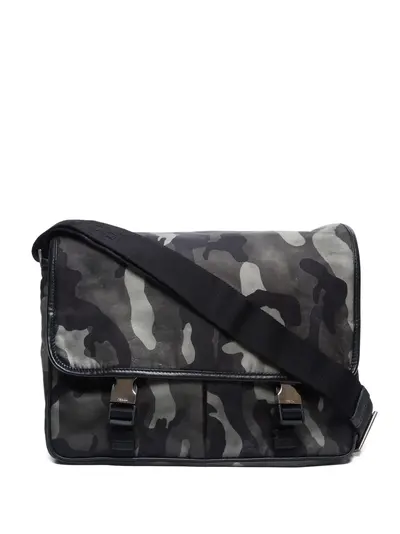 circa 2010-2020 green camouflage pattern black leather trim adjustable shoulder strap foldover top two buckles closure rear zip-fastenig pocket Condition: GOOD. This previously owned and used item is in good condition with minimal signs of use. This may include fading of material or plating and scratches.