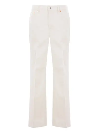 white flared hem five pockets button fastening belt loops leather logo patch