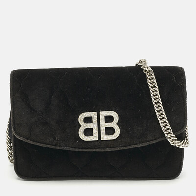 Opulence meets modern edge in this Balenciaga Wallet on Chain, crafted from black quilted velvet and adorned with shimmering BB crystal embellishments. Equal parts clutch and crossbody, it’s designed to turn heads at evening affairs or upscale events.