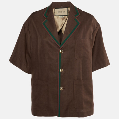 Gucci’s bowling shirt blends relaxed tailoring with signature house elements, featuring the iconic Web stripe in a linen blend fabric. The brown tone channels vintage leisurewear with modern flair. Pair with tailored shorts or crisp trousers.