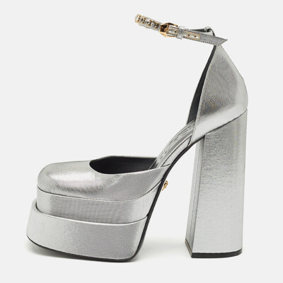 Behold the resplendent Versace Aevitas pumps, a testament to opulence and refinement. Crafted with sumptuous metallic grey fabric and adorned with exquisite gold tone accents, these pumps exude glamour and finesse. Elevate your ensemble with a touch of timeless luxury and undeniable allure.