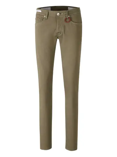 olive green button and zip front fastening classic five pockets rear logo patch belt loops straight leg