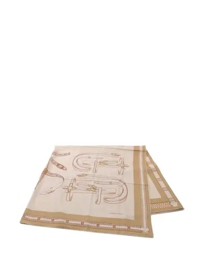 circa 2020 beige background herringbone pattern equestrian harness pattern brown and gold details silk-cashmere blend Condition: UNWORN. This item is previously owned but remains unworn and in its original condition. However, it does not come with its original tags.
