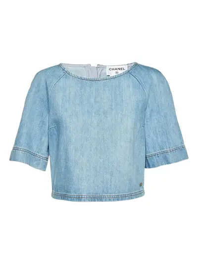 circa 2024 light blue denim raglan sleeves back zipper closure topstitching detail hemline detail Condition: GOOD. This previously owned and used item is in good condition with minimal signs of use. This may include fading of material or plating and scratches.