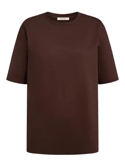 dark brown crew neck dropped shoulder seams side slits straight hem casual style