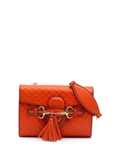 embossed leather body chain link strap with leather guard front flap with a slip through closure tassel detail interior slip pocket orange Serial Number: 449636 560440 This item has no inclusions. Condition: GOOD. This previously owned and used item is in good condition with minimal signs of use. This may include fading of material or plating and scratches. Please refer to the photos on this product page for a detailed view of the item, including any damages declared.